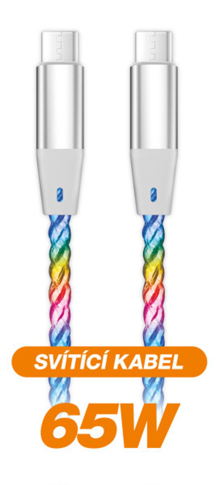 Duhově svítící LED kabel řady ALIGATOR POWER s kovovými konektory USB-C/USB-C nejvyšší kvality, o výkonu 65W a možností nabíjení až 3A.