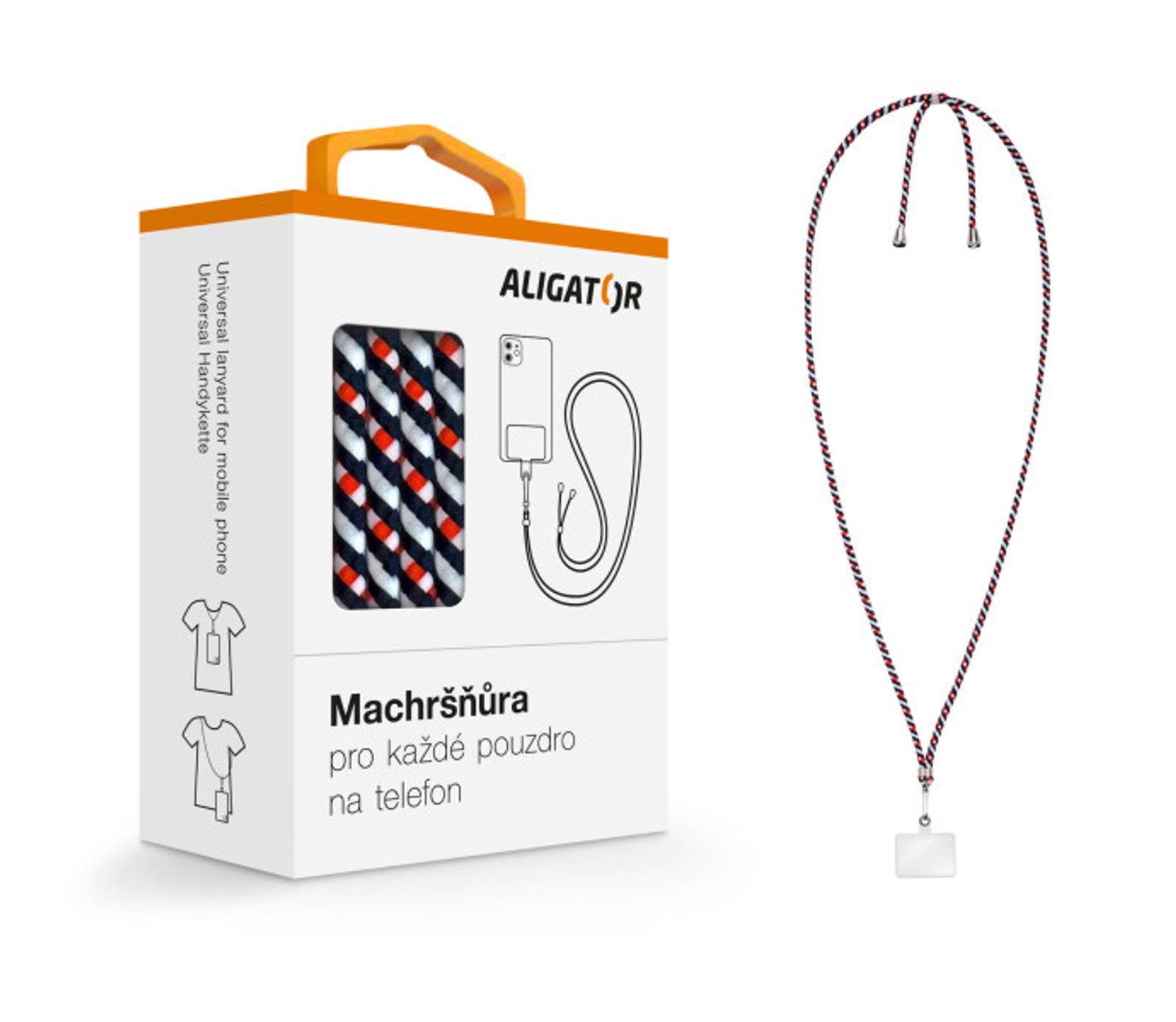 Díky univerzálnímu řešení můžete snadno plastovou vložku umístit do téměř jakéhokoliv pouzdra, zúženou část protáhnout otvorem pro konektor, zafixovat vložením mobilního telefonu do pouzdra a následně připnout karabinu s Vámi vybranou šňůrku.