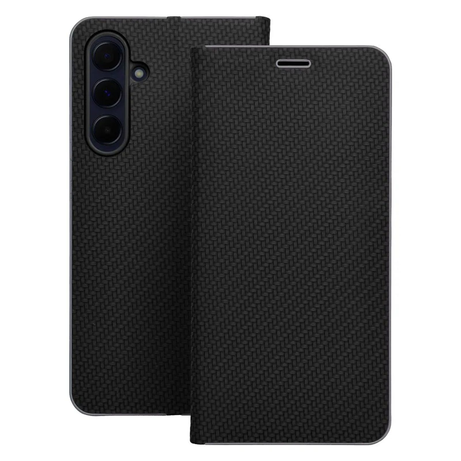Moderní zavírací obal typu Luna Book Carbon poskytuje účinnou ochranu pro váš mobilní telefon. Matný vroubkovaný materiál ve spojení s lesklým kovovým rámečkem vytváří jednoduchý, ovšem velmi elegantní a stylový design. Toto pouzdro představuje originálního společníka pro každodenní užití, a to jak do práce, tak třeba na cesty. Měkký semišový materiál uvnitř a v části držáku chrání zařízení z obou stran před poškozením a poškrábáním.